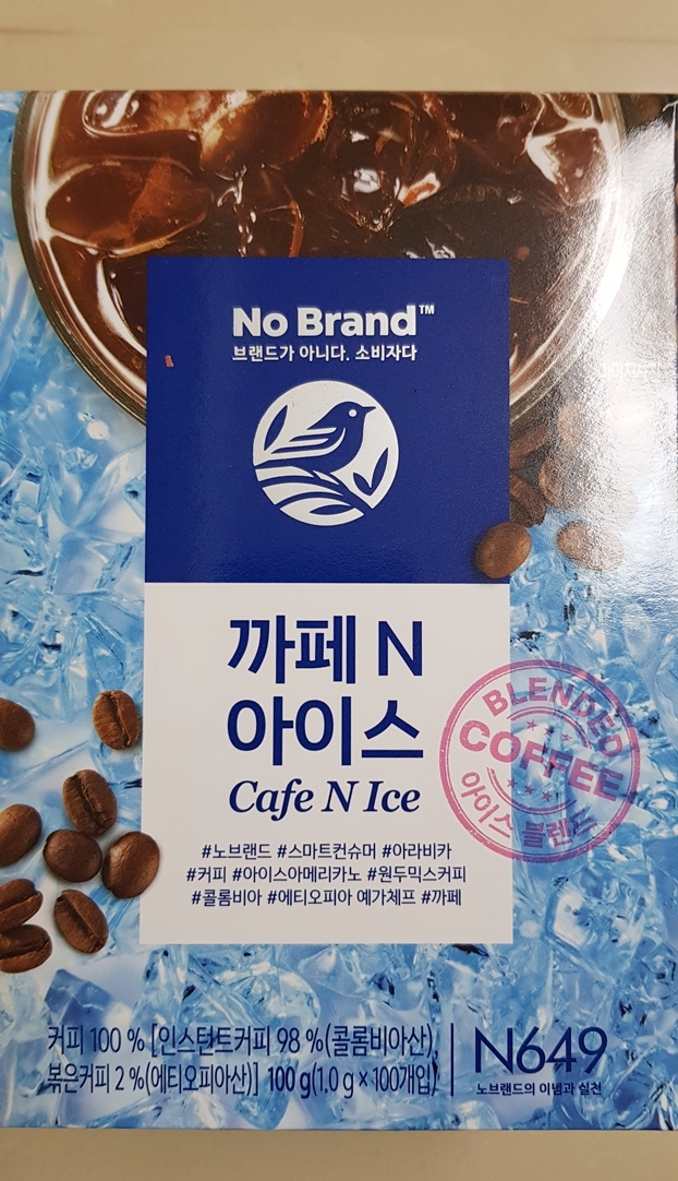 인스턴트커피 98%와 볶은커피 2%의 함량이 표기된 블루 색상의 포장케이스네요.