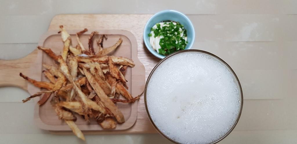 다른 안주보다 포만감이 적기 때문에 시원한 맥주하고 같이 먹으면 계속 먹게 되는 술안주에요.